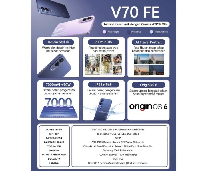 Here, three color choices are anticipated: Titanium Silver, Ocean Blue, or Muse Purple. The Vivo V70 FE’s Dimensity 7360 Turbo chip powers all of the hardware. Eight cores and a 2.5GHz boost clock are features of that SoC. Prior to the V70 FE variant, this chip was also utilized on the Vivo V60 Lite.